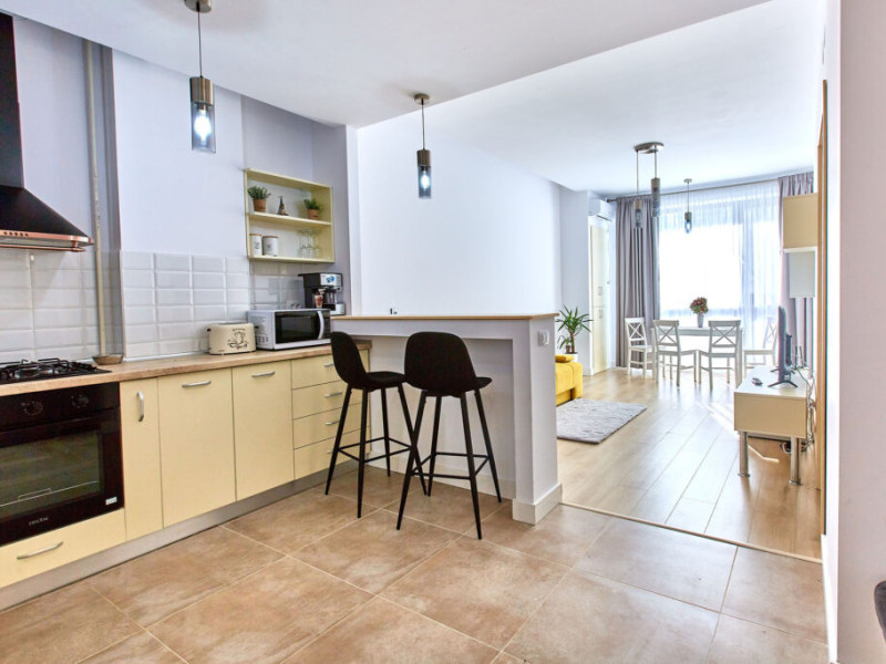 Apartamentul Mavi Onix se compune din living cu canapea extensibila si cu bucatarie open space (dotata cu plita, cuptor, frigider, microunde, prajitor, hota, vesela, aparat de cafea), dormitor cu pat matrimonial, separat cu usa, baie cu dus walk- in si masina de spalat rufe, tv este disponibil in ambele camere, aer conditionat, internet, si centrala propie. Adresa: Strada D25, nr 5, bloc B4, etaj 2.