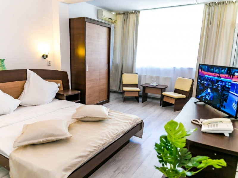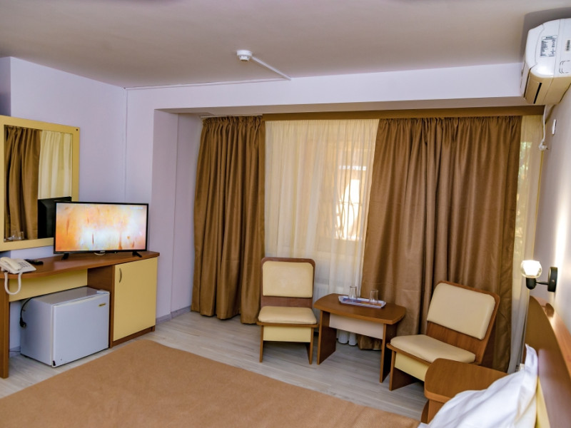 Camerele sunt mochetate si dotate balcon, masuta si scaune de odihna/ relaxare, baie proprie cu cabina de dus, frigider / minibar, aer conditionat, telefon, TV, internet.