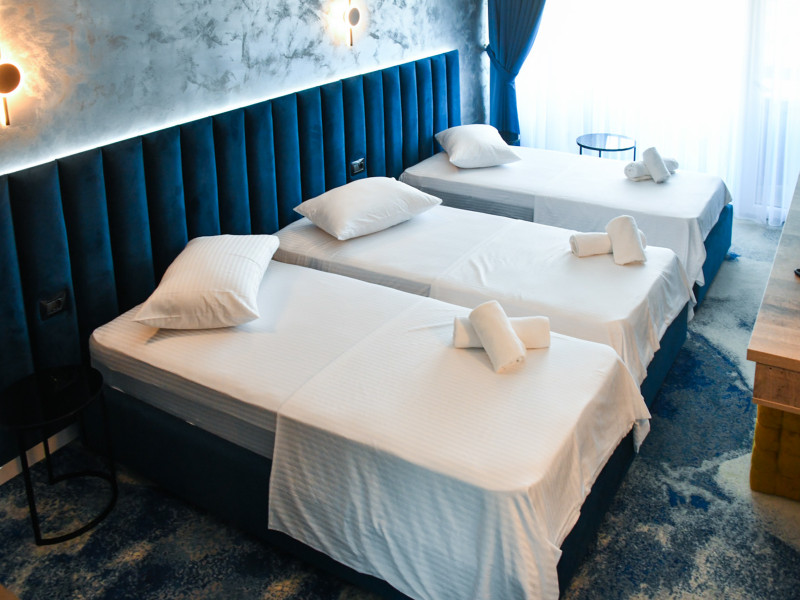 Camerele triple, cu o suprafata de aproximativ 18 mp, sunt mai spatioase si au in dotare 3 paturi de o persoana din care 2 paturi se pot uni, au balcon si au fost renovate integral in 2023, AC, TV, minibar, internet, bai cu cabina de dus, uscator de par si obiecte de toaleta. Camera poate acomoda 3 adulti.