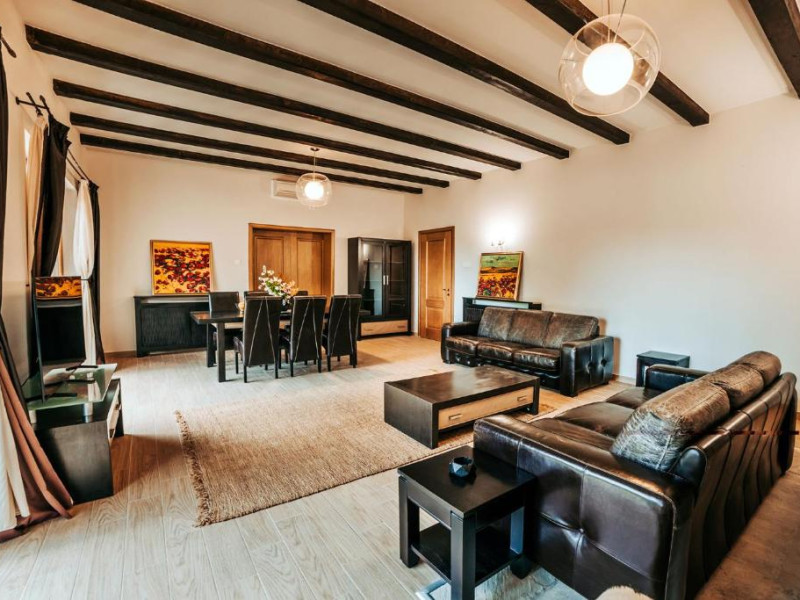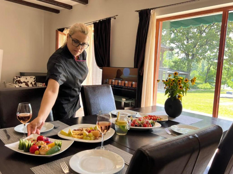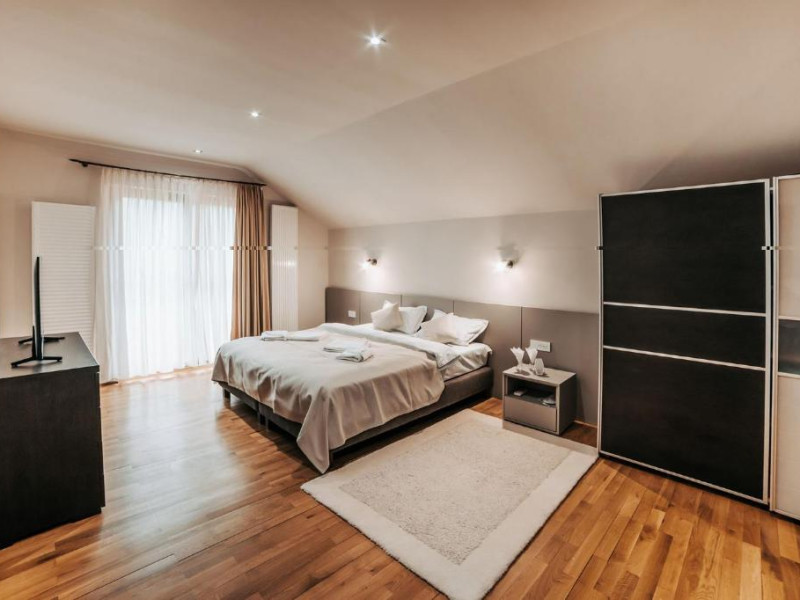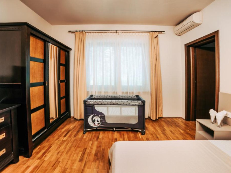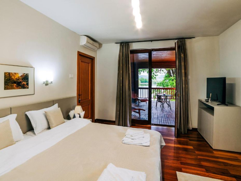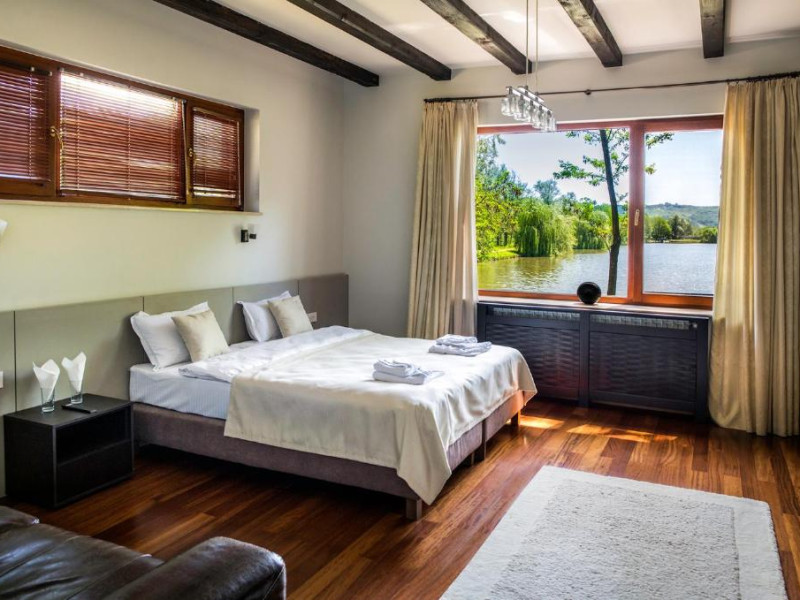 Casa Lac – cu o suprafata de aproximativ 180 mp, are 4 dormitoare fiecare cu pat matirmonial si baie proprie cu dus, vedere la lac/gradina,bucatarie utilata, AC, TV, internet. Poate acomoda 8 adulti, suplimentar 4 copii, inchiriere integrala vila.