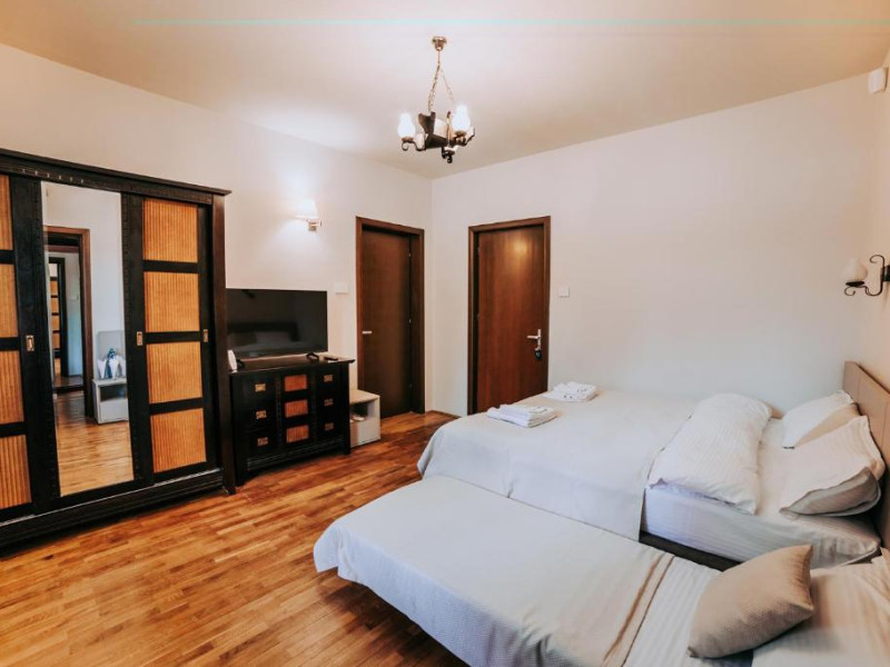 Casa Peluza – cu o suprafata de aproximativ 100 mp, are 3 dormitoare fiecare cu pat matrimonial si baie proprie cu dus, sufragerie cu canapea extensibila, balcon cu vedere lac, dar si la gradina, bucatarie utilata, AC, TV, internet, Poate acomoda 6 adulti, suplimentar 2 copii, inchiriere integrala vila.
