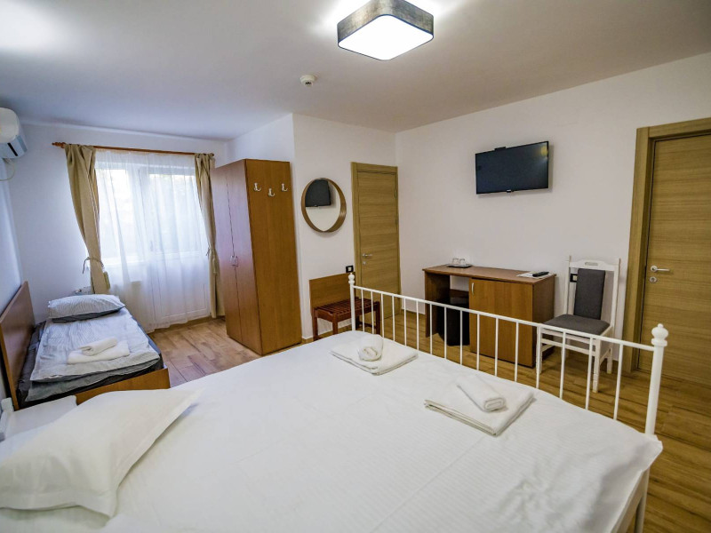 Camera Tripla - are pat matirmonial si un pat pentru o persoana, este spatioasa si potrivita pentru trei persoane, familii sau grupuri mici. Este dotata cu baie proprie cu dus, aer conditionat, Wi-Fi, frigider, uscator de par, aparat anti-tantari si prosoape incluse, iar curatenia este efectuata zilnic.