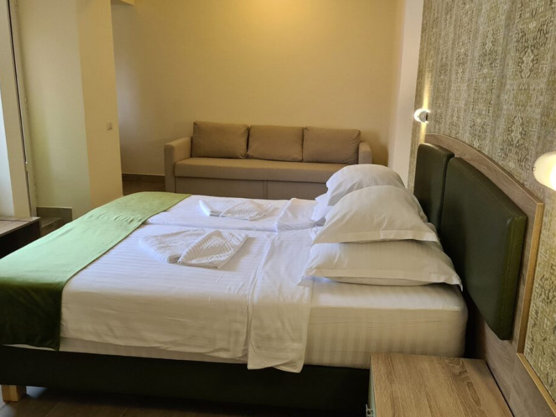 Camera family -  suprafata de 24 mp, camera are in componenta pat matrimonial de 180/200 cm, canapea extensibila 160/200 cm ,priveliste panoramica si balcon cu masuta si doua scaune.